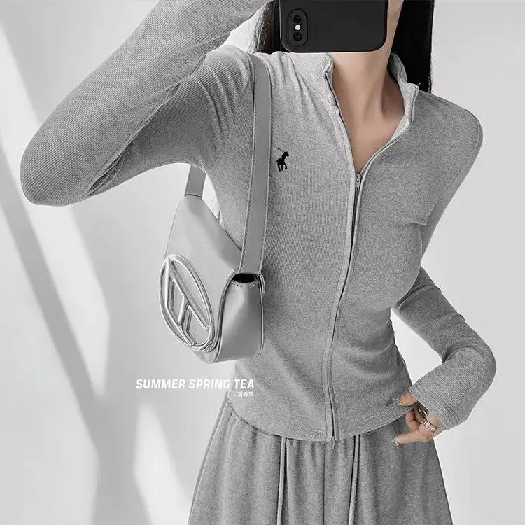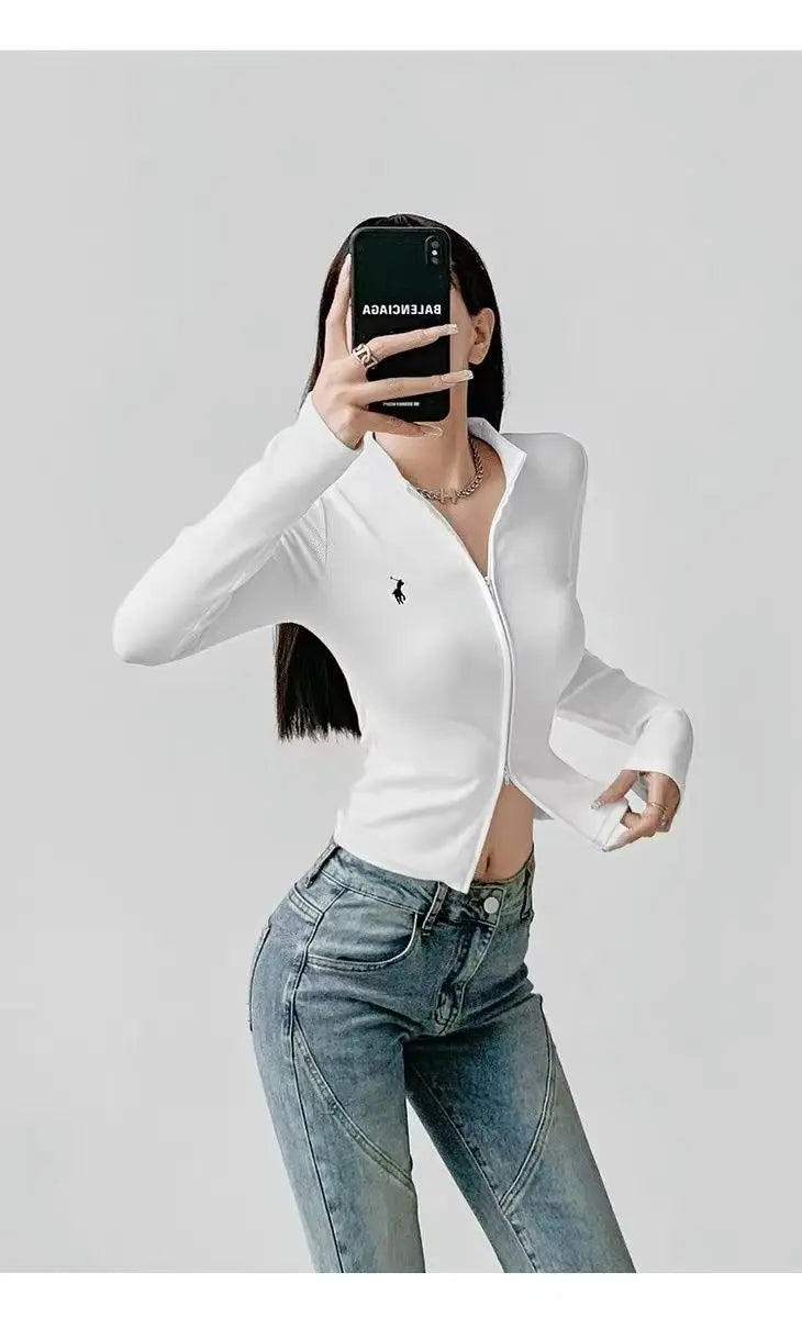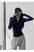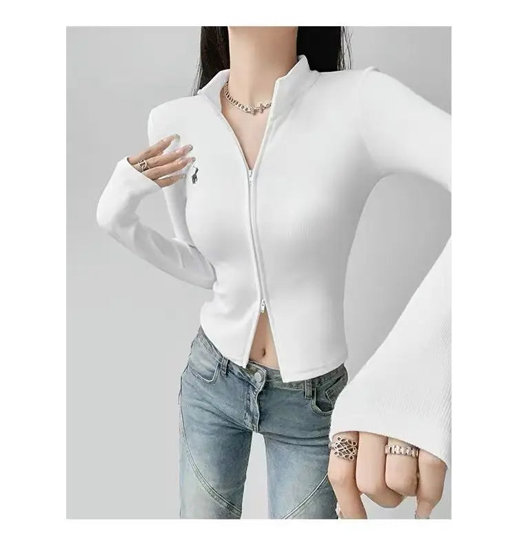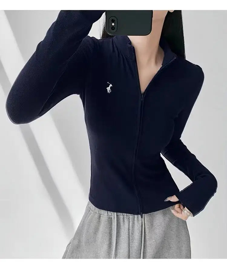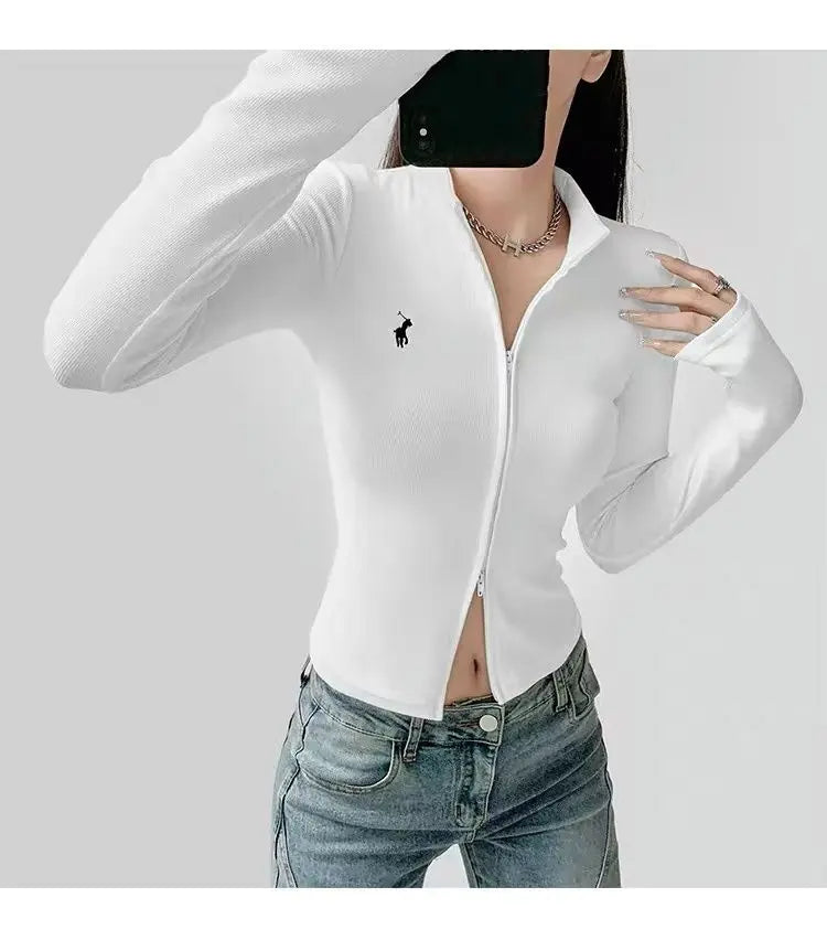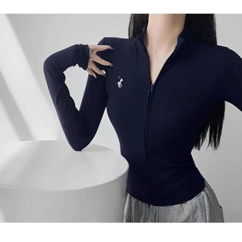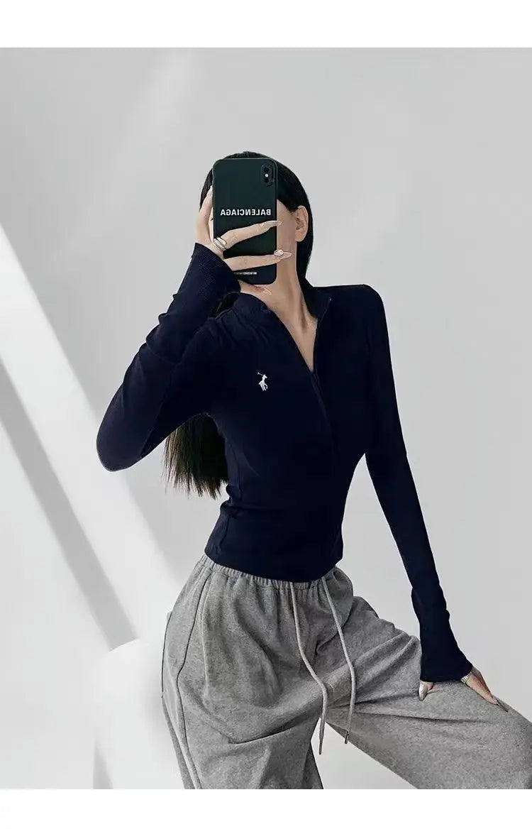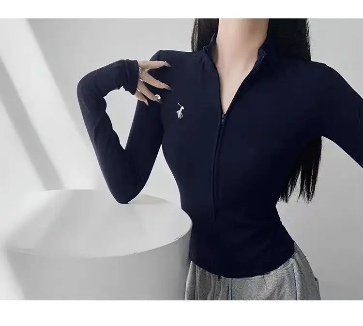 This long-sleeve top is the perfect blend of comfort and style. The slight stretch fabric allows freedom of movement, while the zipper details add a modern, casual edge. Ideal for layering during autumn and winter or wearing alone for a chic everyday look.