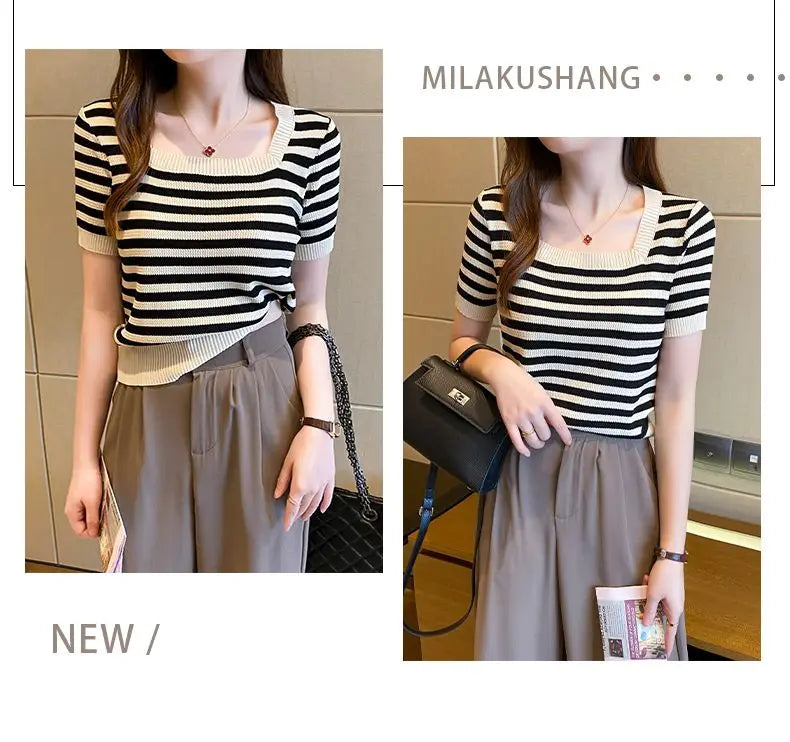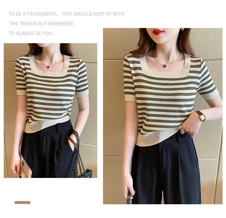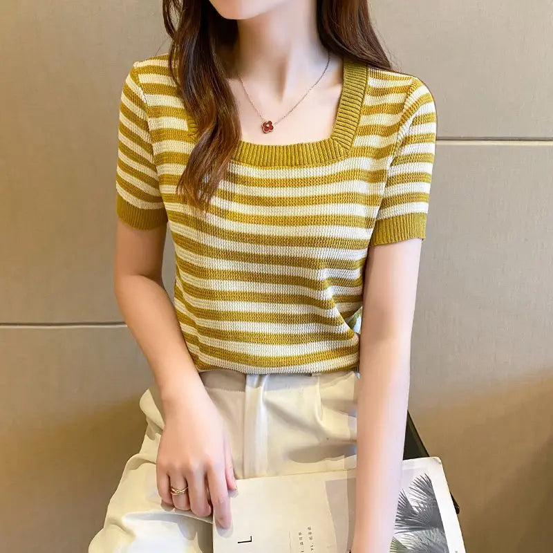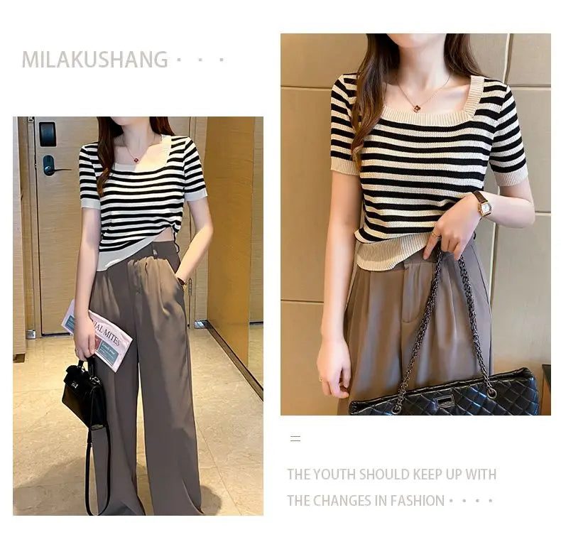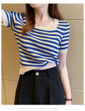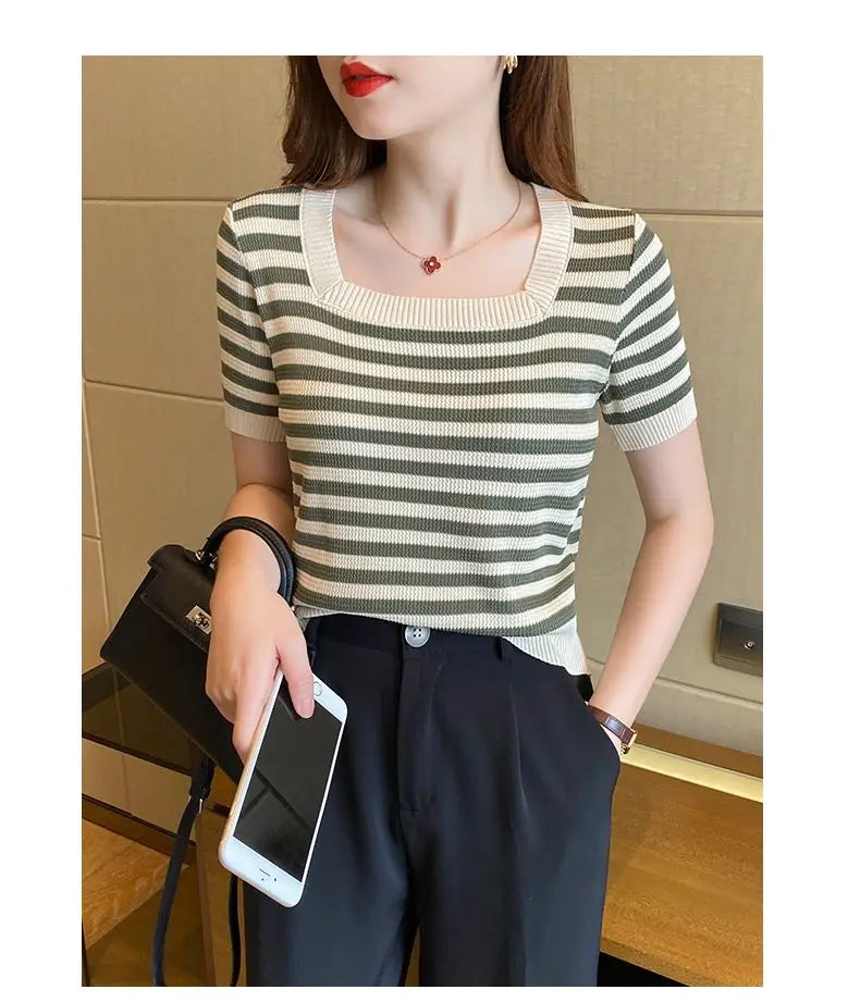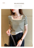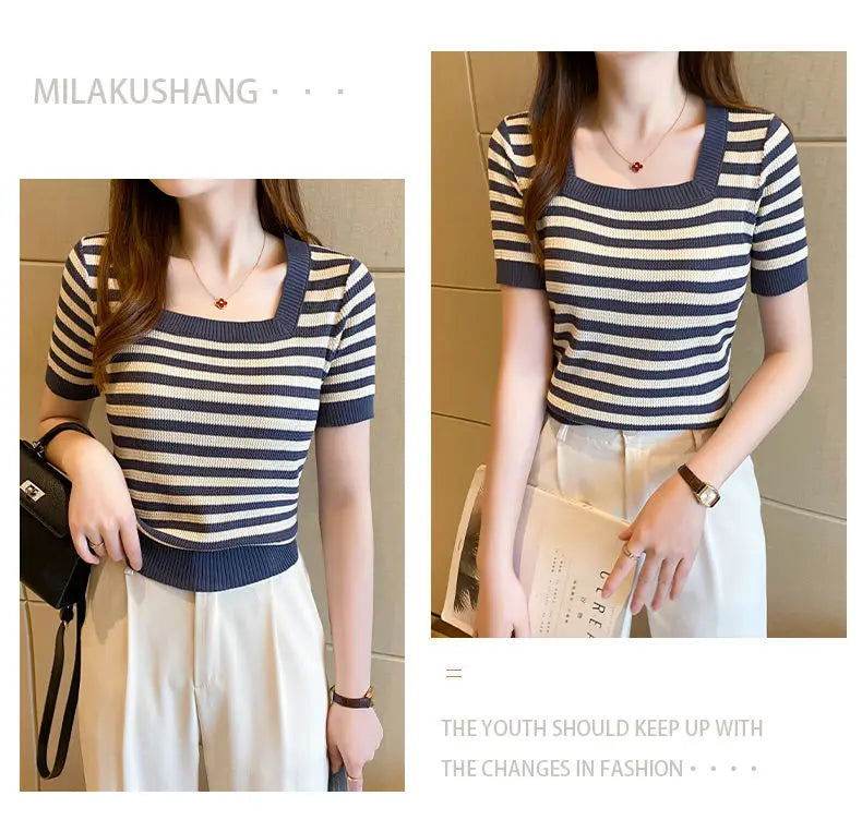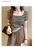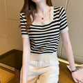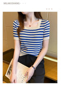 🌟 Korean Casual Women’s Summer T-Shirt – Slim Knit Top with Square Collar 🌟
