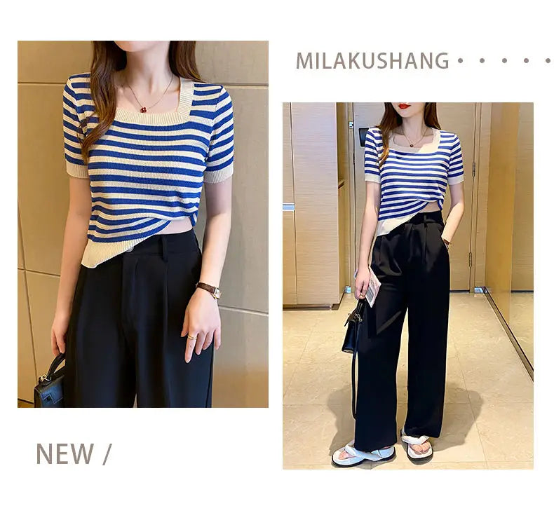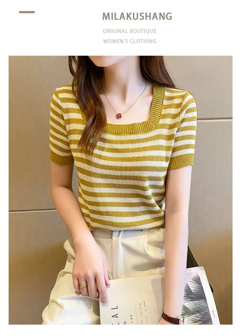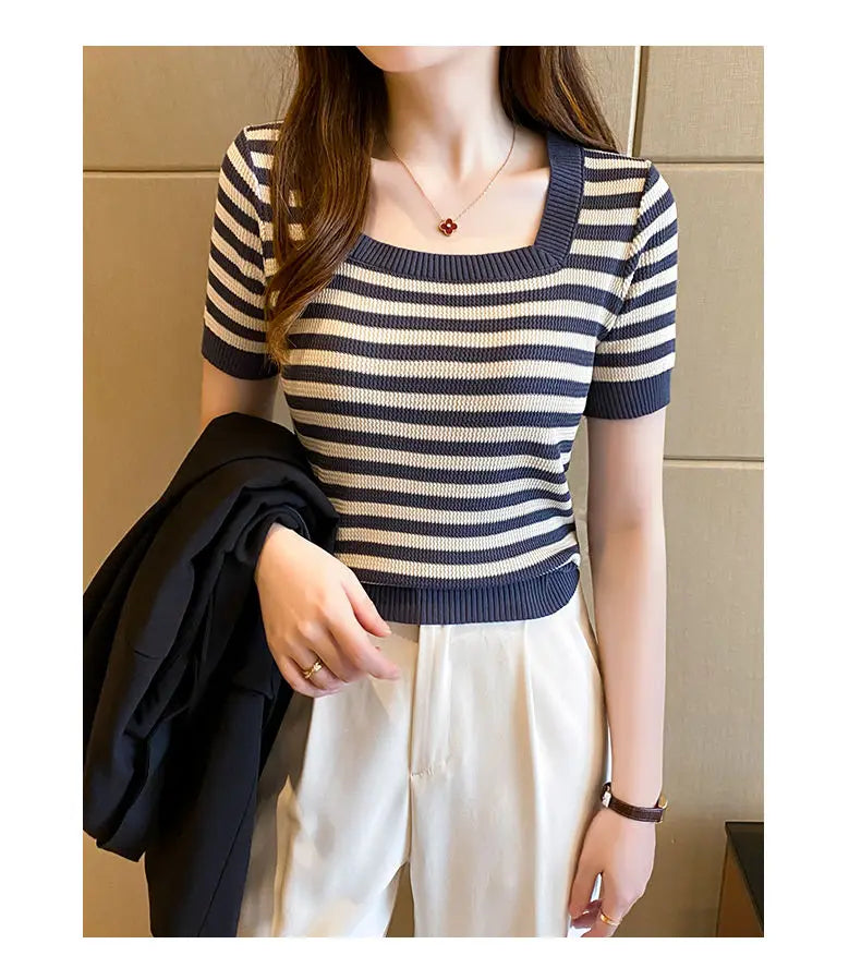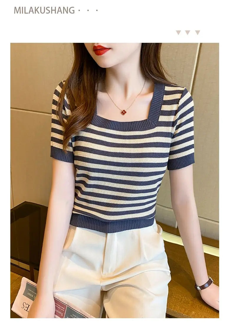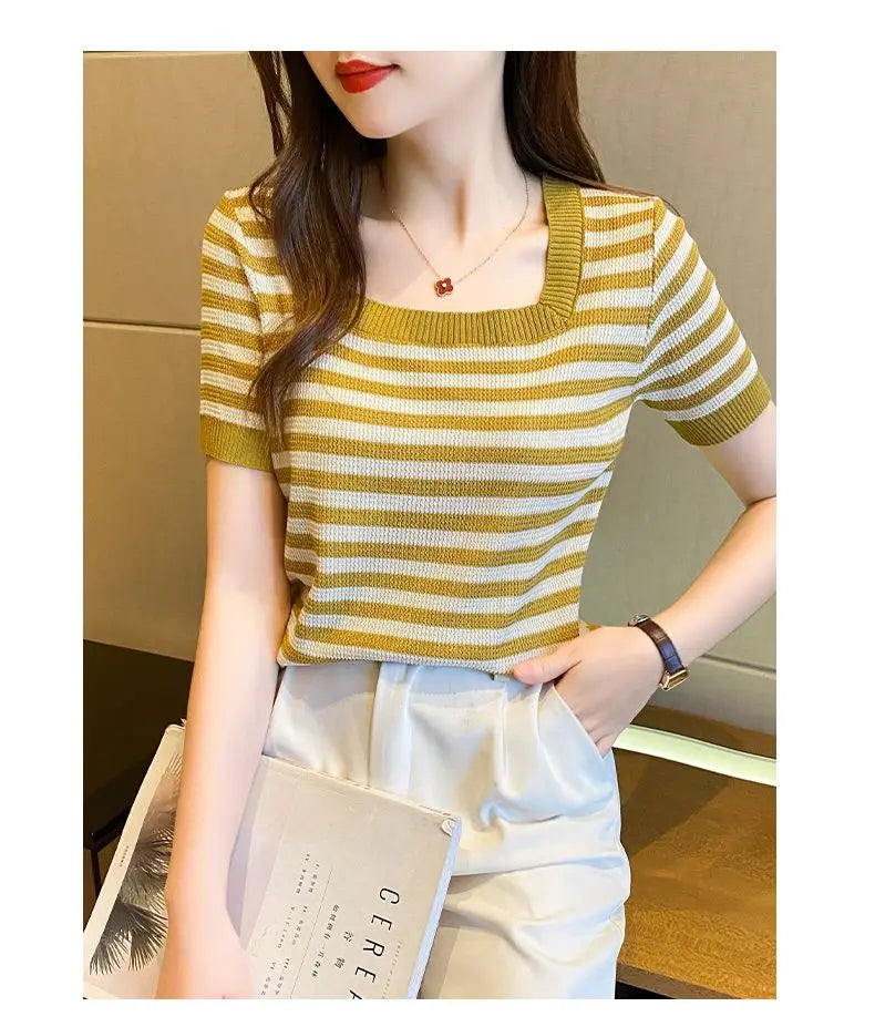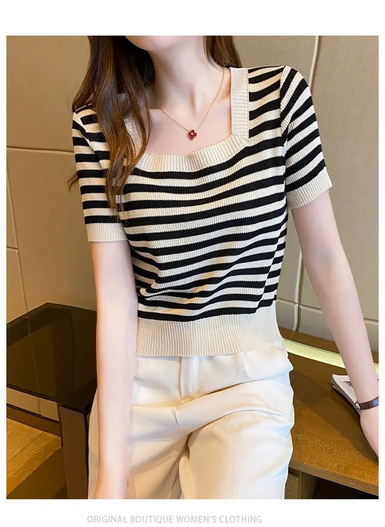 🌟 Korean Casual Women’s Summer T-Shirt – Slim Knit Top with Square Collar 🌟