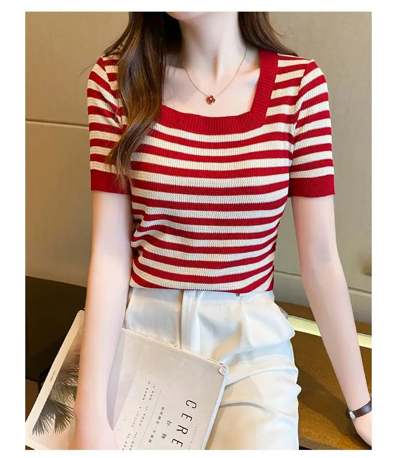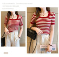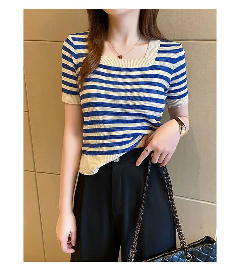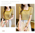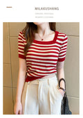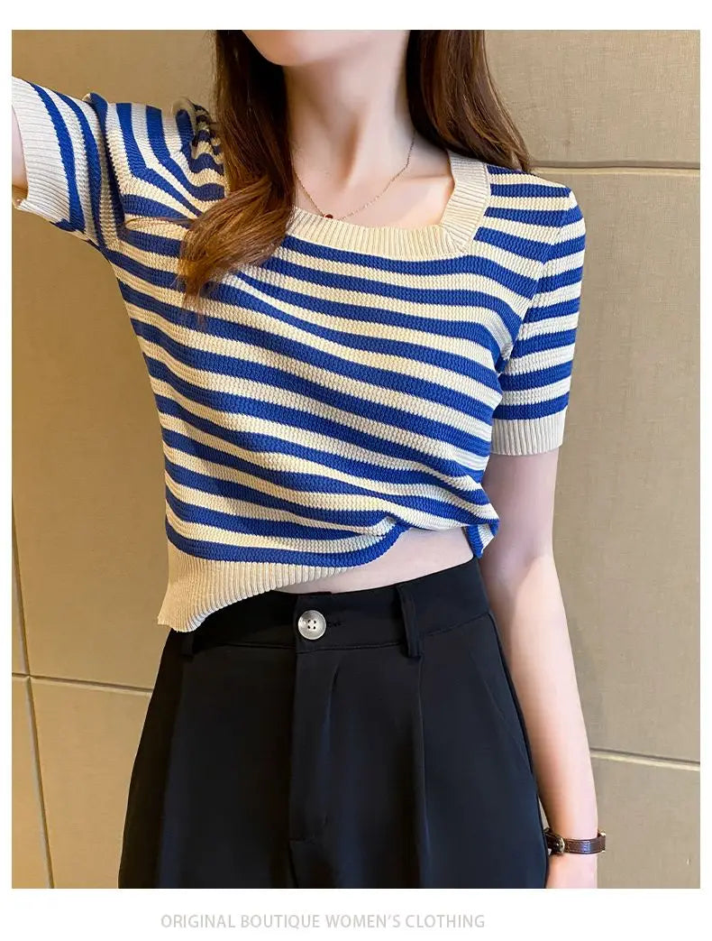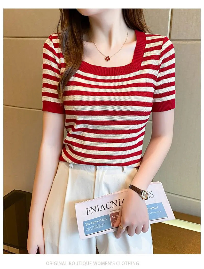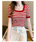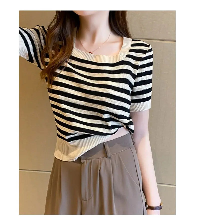 🌟 Korean Casual Women’s Summer T-Shirt – Slim Knit Top with Square Collar 🌟