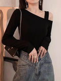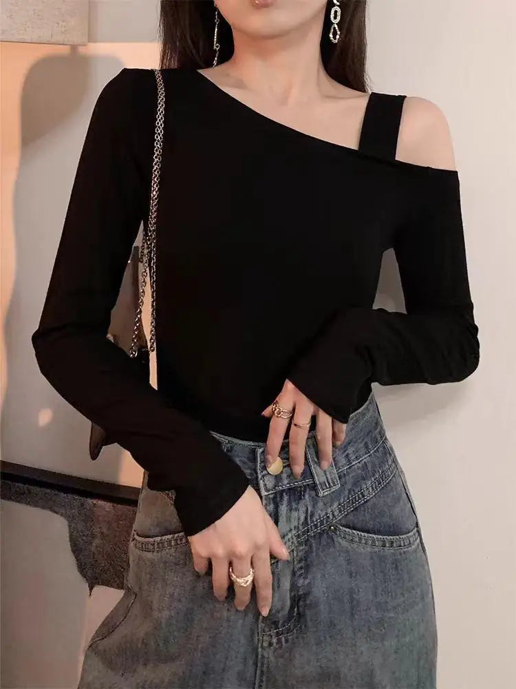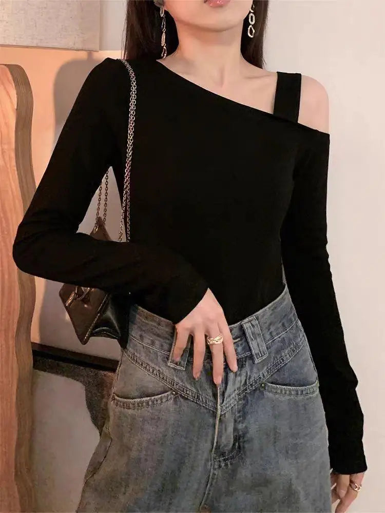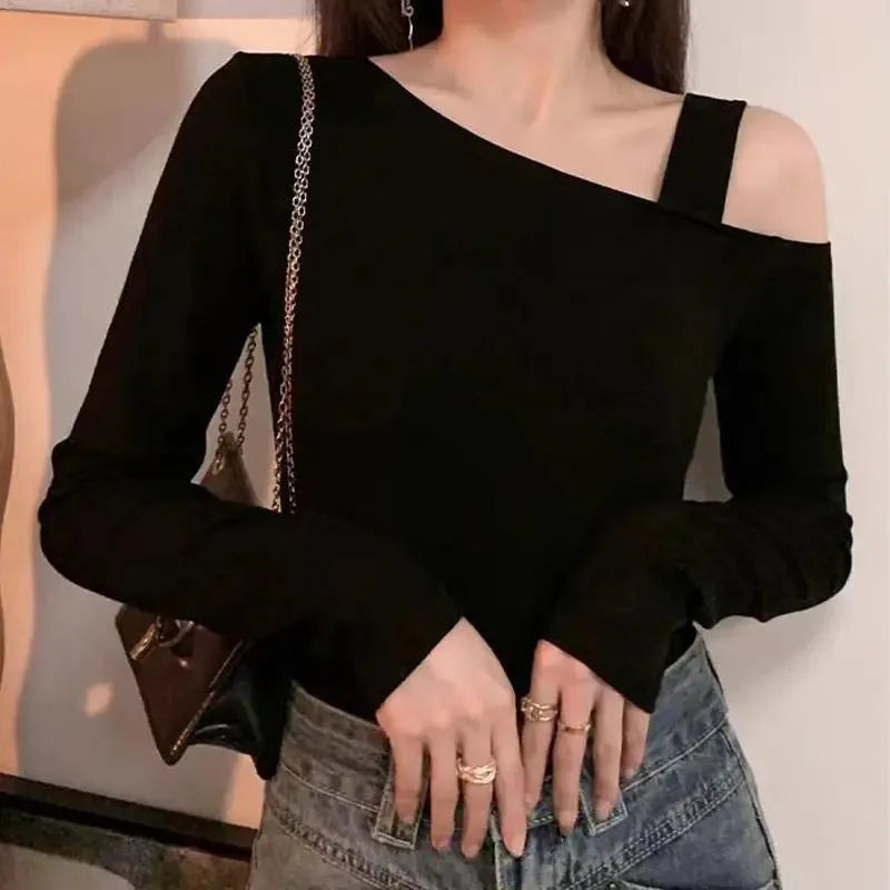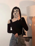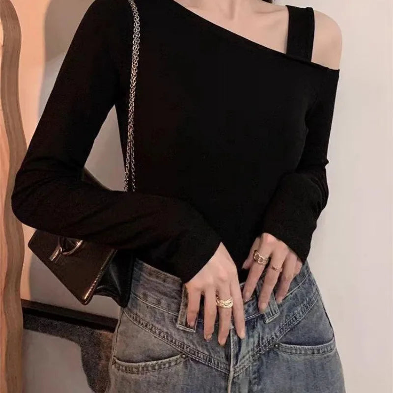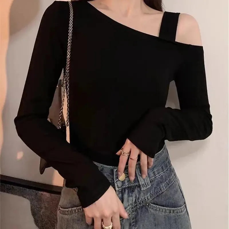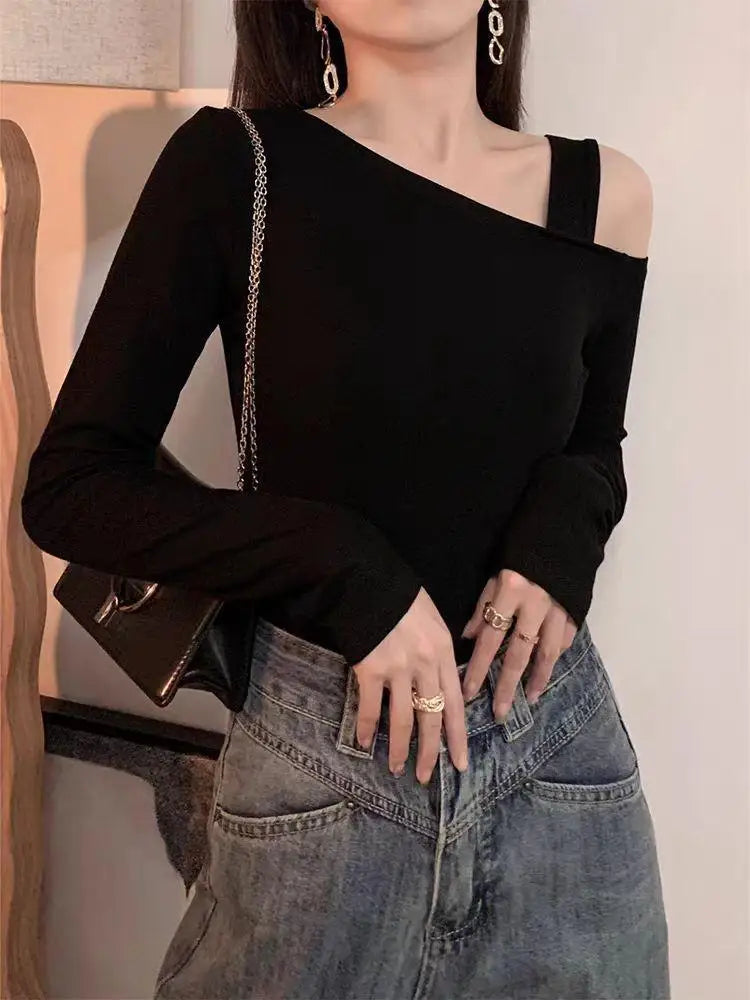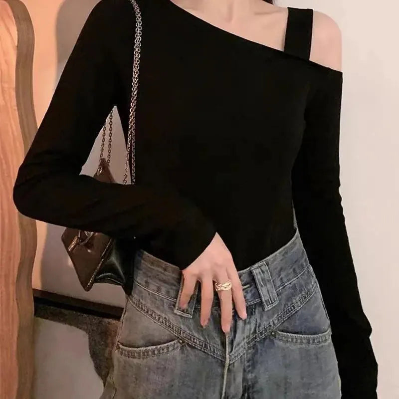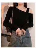 This skew-collar long-sleeve top combines classic style with a modern twist. The slight stretch knit fabric ensures comfort while maintaining a flattering silhouette. Perfect for autumn nights, parties, or casual outings, its solid color and minimalist design make it easy to pair with jeans, skirts, or pants for a chic, effortless look.